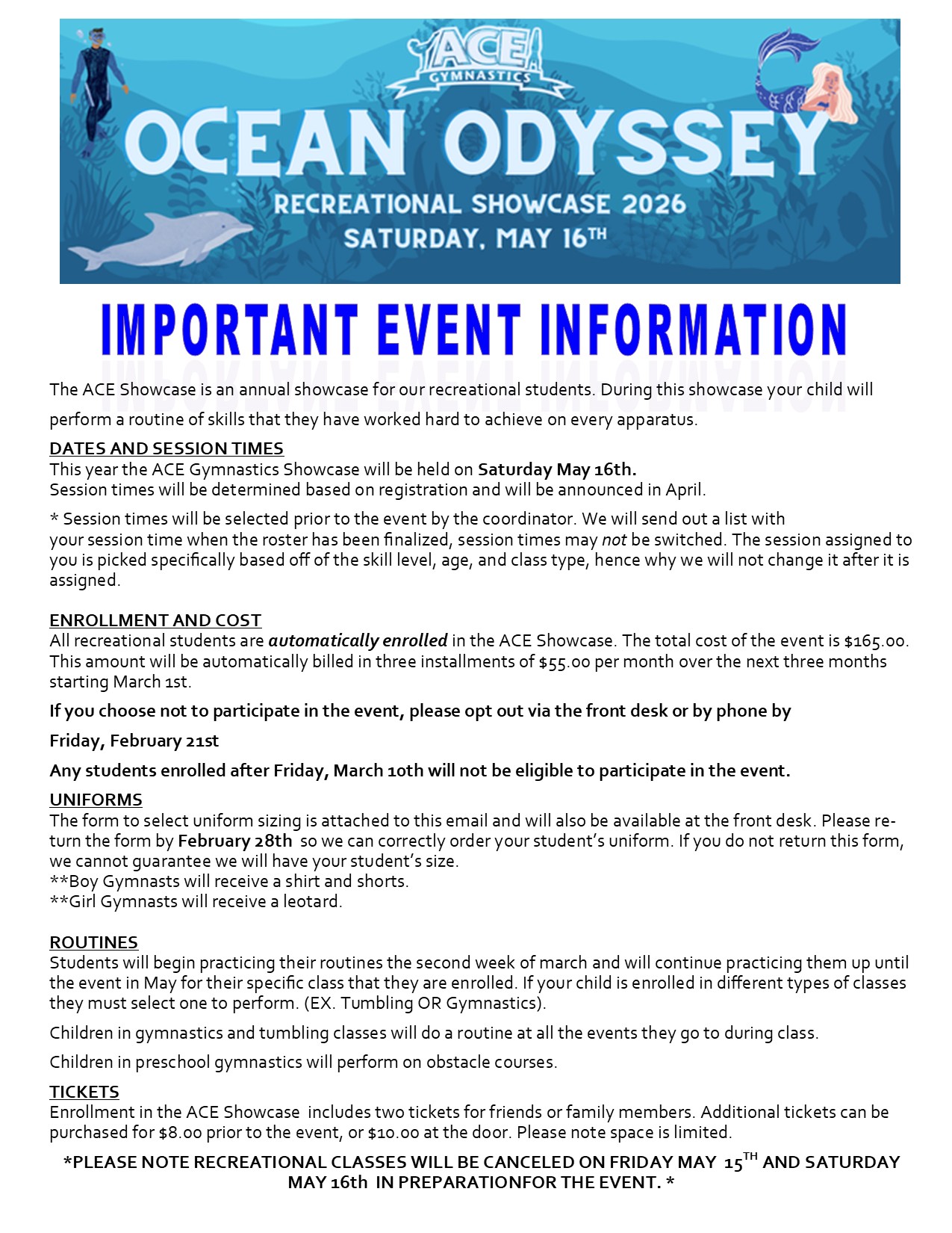 Special Offers Try a Class for FREE! Program Registrations Competitive Team Registration Form After School Registration Recreational Class Registration Events Registration Birthday Party Commitment Special Events Waiver Waivers & Releases Special Events Waiver Medicine Release Form 30-day Drop Notice Competitions 2025 DBO Registration Other Employment Application ACH Payment Information ACE SHOWCASE Ocean Odyssey Recreational Showcase Informational Package 2026 Ocean Odyssey Recreational Showcase Uniform Order Form